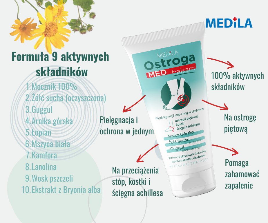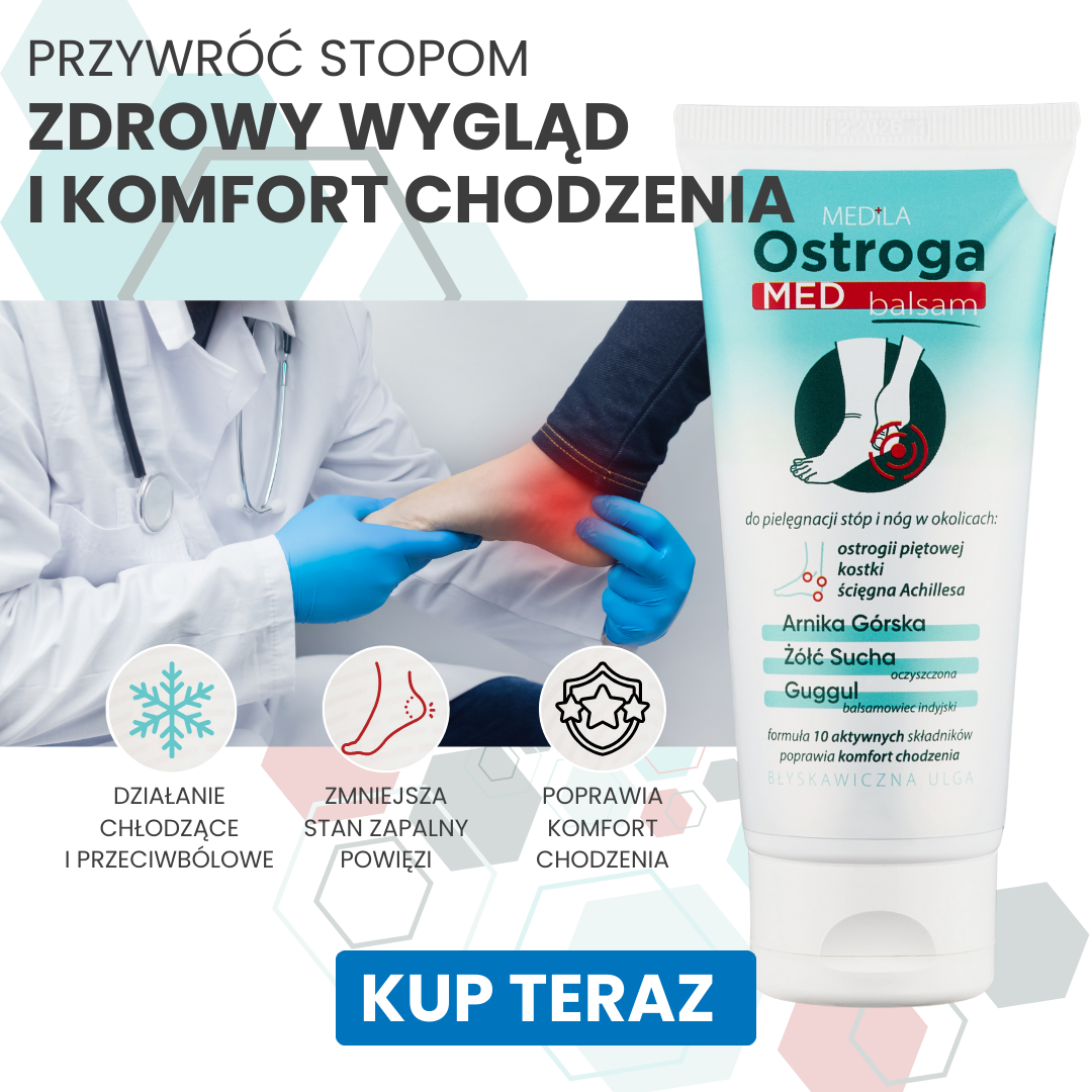 OstrogaMed zmiękcza i pielęgnuje skórę, redukując dyskomfort związany z ostrogą piętową. Regularne stosowanie balsamu może przynieść ulgę i poprawić kondycję stóp.